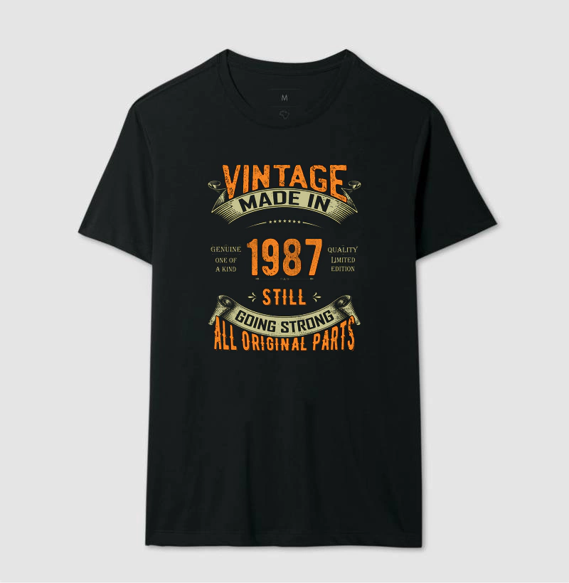 Design Exclusivo: A frase "Vintage Made in 1987 Still Going Strong" em letras vibrantes na cor laranja destaca-se de maneira elegante, transmitindo uma mensagem poderosa de durabilidade e estilo atemporal.