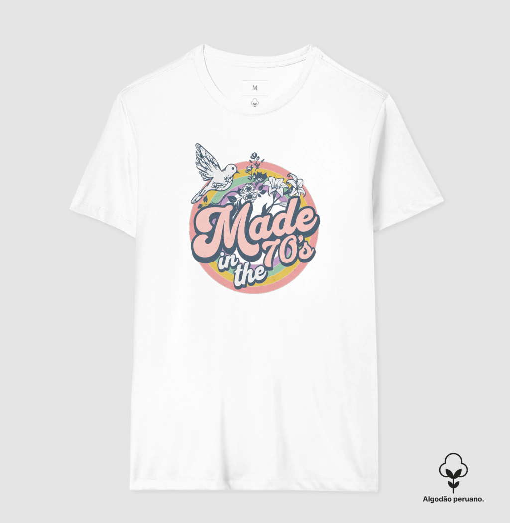 Descubra a elegância atemporal e o charme vintage com nossa exclusiva camiseta "Made in the 70's". Esta peça única traz uma estampa vibrante de flores delicadas e um pássaro branco, simbolizando liberdade e beleza natural. Inspirada na década de 70, a camiseta celebra uma era icônica de expressão e estilo.